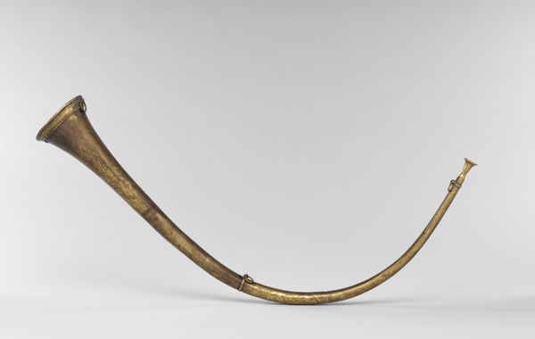 Here, we have a hunting horn, made by Václav Frantisek et Fils Cervény. The most striking element is its circular form, almost a perfect loop, which dominates the composition. The eye is drawn to the large circle and the flared bell, creating a visual rhythm. The materiality of the horn, with its metallic sheen and warm brass tones, invites contemplation on the relationship between form and function. This is not merely an instrument; it is a designed object. The circle, a shape often associated with harmony and completion, is disrupted by the functional elements—the mouthpiece and the bell—introducing a tension between aesthetic form and utilitarian purpose. The horn may seem like a simple object, yet it embodies a complex interplay of cultural codes and artistic interpretation. Notice how the horn’s curves and lines destabilize the static display. The open circle suggests continuation, a challenge to fixed meanings, echoing the dynamic nature of music itself.