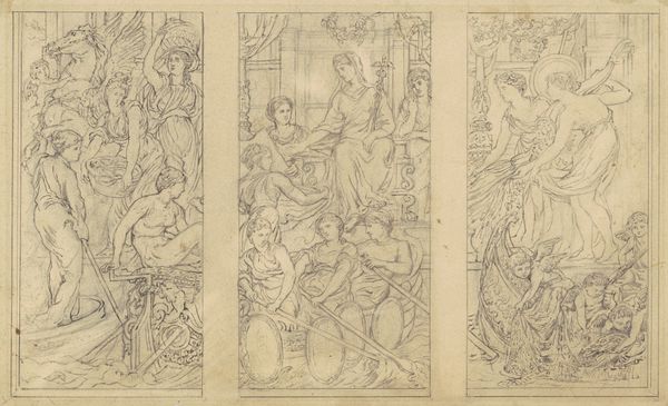Curator: Immediately, I'm struck by the ethereal, almost dreamlike quality of this piece. The delicate lines and subtle use of gold create a sense of otherworldly beauty. Editor: This is Simeon Solomon's "Eight Scenes from the Story of David and Jonathan," currently held in the Tate Collections. Solomon, born in 1840, was a British Pre-Raphaelite artist known for his explorations of biblical themes and, importantly, his own identity as a Jewish and gay man in Victorian England. Curator: Knowing Solomon's biography, it adds layers of interpretation. The intense bond between David and Jonathan, often interpreted as homoerotic, takes on a new dimension. Were these figures representations of his own hidden desires and social constraints? Editor: Absolutely. The artwork, though seemingly biblical, operates on several planes. Solomon uses the familiar narratives to explore themes of love, loss, and societal expectations. The unfinished nature also speaks volumes, suggesting perhaps a story perpetually in formation, always subject to interpretation. Curator: It makes me question the power dynamics at play, not just within the narrative but also in its reception and the institution that displays it today. How has its meaning been shaped by changing social attitudes? Editor: Indeed, and how do we, as viewers, contribute to that ongoing dialogue by bringing our own perspectives on gender, sexuality, and faith? Curator: It's a poignant reminder that art is never truly finished, but rather a continuous conversation across time. Editor: And one that challenges us to confront the complexities of identity and representation in the public sphere.
