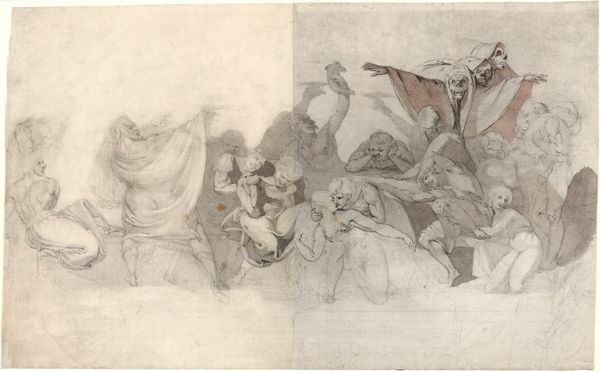 Curator: This image exudes such intensity. The figures seem caught between worlds. Editor: Indeed. What we’re seeing here is a drawing by Henry Fuseli, dating from the 1760s, titled "The Duke of Gloucester Lying in Wait for Lady Anne at the Funeral Procession of Her Father-in-law, King Henry VI." It's rendered in pen, ink, and charcoal on paper. Curator: The stark contrasts create such dramatic tension. The watchful Duke almost merges with the shadowed architecture to the left, cloaked in an uneasy silence. You feel his plotting reverberating outwards. Editor: Fuseli was fascinated by Shakespeare and English history, and often used art to engage in the political discourse around monarchy and power. Note how the scene, set during a royal funeral, is ripe with usurpation. Curator: There's something almost theatrical about it. The gestures, particularly the figure gesturing toward the heavens, possess the melodramatic quality of stage acting. How might this speak to the way history and memory were performed then? Editor: Precisely. It tells us about the social and theatrical constructs through which historical narratives were told and consumed. This isn't just history; it’s a construction, reflecting contemporary anxieties and perhaps, Fuseli's own republican sympathies. Curator: Looking at the central figure with his arm raised... It reminds me of depictions of biblical lamentations; as if both divine mourning and human betrayal share the same space, using gesture to expose inner turmoil. Editor: The power dynamic he's depicting plays on age-old concepts about who writes history and whose voices are centered in the dominant narrative. Curator: In its way, this drawing almost visualizes suppressed emotions bubbling to the surface. It speaks about how we, as people, often conceal or negotiate between who we appear to be, and what might be simmering beneath. Editor: Exactly, that internal, suppressed realm finds articulation through the symbols of history, drama, and even mourning, reminding us how artistic expression mediates with the societal currents. Curator: It definitely prompts us to consider the subtle cues embedded within imagery and the powerful influence they hold. Editor: Ultimately, the work provides a critical view of political maneuverings but also provides lasting insights into human desires.