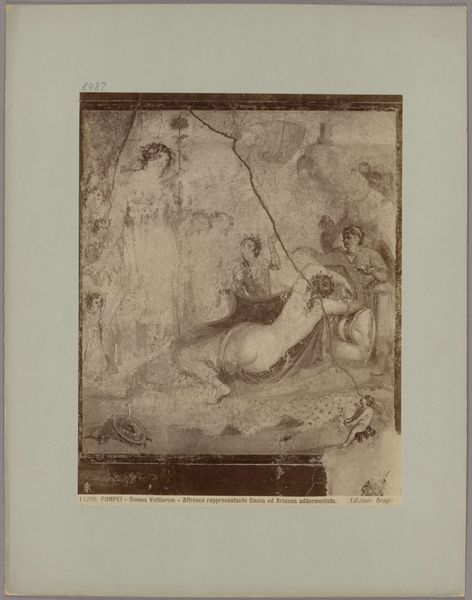 Editor: Here we have Giacomo Brogi’s photograph, taken around 1880-1890, of a Pompeiian mural painting, entitled "Pompeii, Domus Vettiorum, Flying Group of Neptune and Woman." It's printed on albumen paper. Looking at the image, I'm struck by how even in this aged photograph, I can sense the dynamic energy of the figures. What kind of symbolic meaning was conveyed through this composition? Curator: Consider that in Pompeiian art, especially within domestic spaces like the Domus Vettiorum, the recurrence of certain figures—Neptune prominently among them—serves as more than mere decoration. These aren't simply images; they are potent symbols deeply entwined with cultural memory and identity. Ask yourself, what did Neptune represent to the Vettii brothers and their guests? Editor: So, not just a depiction of a myth, but a reflection of the owners? I mean, I know they were merchants who became wealthy... Curator: Precisely. Neptune, as a god associated with the sea, embodies not only power but also prosperity, successful voyages, and expansive trade. It suggests the patrons aligned themselves with such symbolic weight, possibly broadcasting their aspirations and successes to those who visited their home. Now, look closer at the embrace... What emotions might that express, and how would they read to a first-century viewer? Editor: Well, the woman certainly looks like she doesn’t mind the embrace. Would that be about the Vettii's virility? The connection to the divine feels really on the nose, though... Curator: Remember, images often carry layers of meaning simultaneously. Eroticism, power, and divine favor may converge to form a multi-faceted declaration of the owners’ status and ambitions. Don’t underestimate the power of symbols to transmit complex messages! Editor: It's fascinating to consider how these ancient symbols worked on so many levels simultaneously – wealth, power, and maybe even a bit of hubris. Curator: Indeed. By recognizing the depth of symbolic communication embedded within these artworks, we unlock invaluable insights into the cultural fabric and individual aspirations of the people of Pompeii.