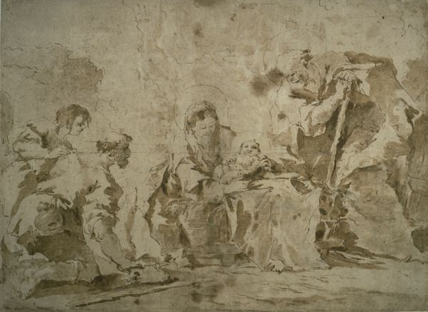 Alessandro Magnasco probably made this drawing using pen and brown ink with brush and brown wash on cream laid paper. The sepia ink allows for a limited range of tonal values and a distinct graphic style, and Magnasco seems to have delighted in these constraints, using the medium to its fullest advantage. The monochromatic palette gives this scene a somewhat anonymous quality. There is a clear contrast between the delicate lines of the ink drawing and the subject matter it describes, a group of peasants or beggars gathered around a shrine, listening to a ballad singer. Magnasco was from a privileged background, so this artwork may give us insight into how the upper class viewed the working class during the artist's time. Through this artwork, Magnasco used readily available materials to portray the materiality of everyday life. In doing so, he prompts us to consider the social and economic contexts that shape both the creation and reception of art.