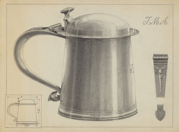 Curator: This is Giacinto Capelli's "Silver Teapot," created around 1936. He rendered it meticulously in pencil. Editor: It's lovely—so unassuming, but the precision creates a quiet intensity. Almost hyperreal, even though it’s just pencil on paper. Curator: Capelli was working in a period fascinated by domestic objects, often elevating them to symbols of order and bourgeois stability, particularly during interwar Europe. Editor: You can really see the hand at work here. The subtle variations in shading, how the pencil reflects light differently depending on the angle, emphasizes materiality and craftsmanship over the object’s functional purpose. Was Capelli interested in commercial applications of his draughtsmanship? Curator: His primary focus was realism and capturing the effects of light, showcasing mastery of his technique, especially working during an era with increasing debates around art’s role and artistic institutions in a time of social upheaval. Editor: Right, there is the silver, the specific use of that metal in the handle—it all implies social stratification of labor, a specific class elevation that can seem very remote. But looking closely at the rendering—so subtle in tone—this feels less about showing and more about careful seeing. Curator: Do you mean a critique of the culture and conditions through subtle observations? It would tie in with other realist explorations in the interwar era where still life gained attention because it stood apart from increasingly monumental sculptures made for propagandist reasons. Editor: Exactly! Capelli transformed an everyday object into something that encourages us to see beyond its surface, pushing beyond what is expected to convey meaning, focusing on labor through precision. I notice how he made it by hand with readily available, cheap materials. This drawing speaks volumes. Curator: I agree. It speaks quietly, like the drawing room conversation where this teapot may once have been present. Editor: Exactly, transforming our gaze and perspective. It is fascinating how simple acts can encourage careful observations.