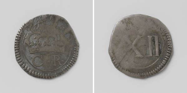 Curator: Look at this striking example of resilience – a silver shilling, also known as twaalf pence, a piece of emergency coinage from Pontefract during the 1648 siege by Oliver Cromwell's forces. An anonymous creation. Editor: The first thing that strikes me is how rudimentary and determined it appears; it embodies that defiant "we shall overcome" spirit despite its small stature, don't you think? Curator: Exactly. This piece tells the story of a town under immense pressure. During the English Civil War, Pontefract Castle remained a Royalist stronghold. With Parliamentarians laying siege, the Royalists inside the castle began striking their own coins out of necessity. This shilling, then, is more than currency; it's a declaration of independence and resistance against Cromwell's Roundheads. Editor: And consider what coinage normally signifies: control, stability, centralized power. Minting your own says, "We are our own power structure now". What symbolism. Curator: Precisely. One face shows a depiction of the castle itself, surrounded by the legend "Post Mortem Patris Pro Filio" which translates to "After the death of the father, for the son"— a reference to Charles II's claim to the throne after his father's execution. Editor: So, we see not just immediate necessity but an active bid for the future political structure, an active statement of belief and Royalist allegiance—it wasn't simply to buy goods; it was an investment in restoring the monarchy. Curator: Absolutely. It provides a fascinating insight into the ingenuity of besieged communities. Forced to use what materials they had, the rough engraving on metal illustrates a point in British history that we understand through wider conflict. Editor: This emergency coin embodies more than survival: the Royalists inside the castle, creating the coin, make this the material culture of resistance itself—an embodiment of active opposition at the centre of societal conflict. Curator: And by understanding the socioeconomic factors we can see the currency's value to our current collections for historical perspective. It offers valuable context for a key moment in British socio-political history, while adding depth and character to a period we tend to understand from books alone. Editor: Exactly. Examining objects like this gives nuance to social understanding beyond any one sided narratives and highlights both past and current issues related to resistance and identity, that the audiences of all ages should be considering.