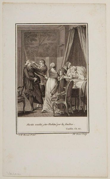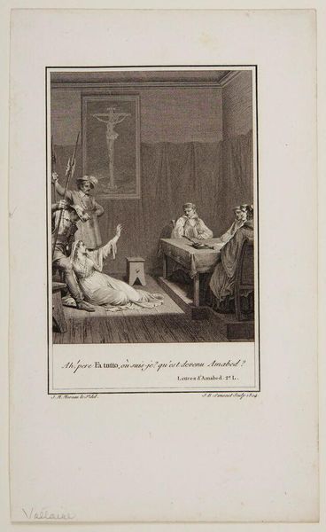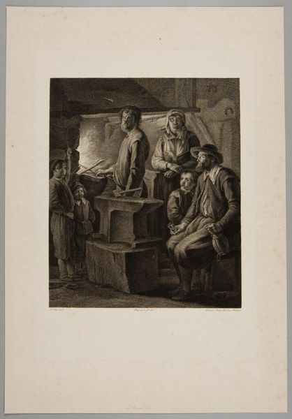 Editor: Here we have Lambert Antoine Claessens' "Death of the Virgin," a print from the Harvard Art Museums. The somber scene is really drawing me in. What kind of story do you think this image is trying to tell? Curator: Well, it’s a tale of grief, of course, but perhaps also of quiet reverence. The dramatic lighting and the clustered figures create a sense of intimacy in a very public moment. There's almost a stage-like quality to it, don't you think? Editor: That's interesting. Now that you mention it, it does feel a bit theatrical. Curator: Right? And that tension between personal sorrow and public display is what makes it so compelling, for me anyway. It’s like a shared experience, but each person is having their own very private reaction. It's a real tear-jerker. Editor: I see what you mean. I hadn't considered the theatrical aspect, but it really adds another layer to the artwork. Curator: Glad I could show you a new perspective.