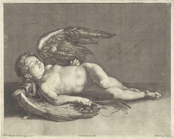Francesco Curti created this print after Reni, depicting Cupid asleep, his arm resting on his quiver and bow. Cupid, the Roman god of love, traditionally embodies desire and affection through his arrows. Here, however, the arrows lie still, suggesting a pause in the relentless pursuit of love. Consider how often we've seen Cupid, wings spread, arrow drawn, a symbol of love's piercing, sometimes painful, arrival. Yet, here, the bow is slack, the quiver untouched. This image echoes motifs found in ancient Greek sculptures of Hypnos, the god of sleep, or even representations of a slumbering Eros, reminding us that these themes of rest and cessation have long been intertwined with powerful emotions and primal urges. There is a poignant vulnerability in this sleeping figure, a reminder that even the most potent forces of desire must sometimes yield to rest. The image resonates with the cyclical nature of love, desire, and the human need for respite. Cupid's sleep is not an ending, but a moment of pause, a breath before the next flight.