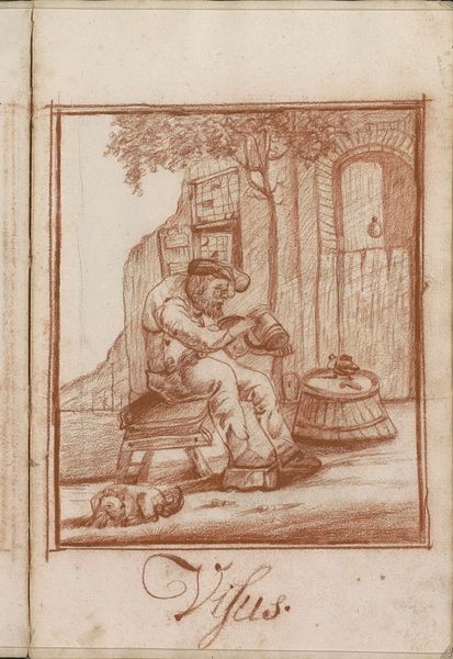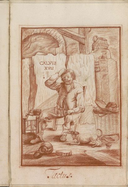 Hendrick van Beaumont's drawing presents a brown monochrome interior scene focusing on a seated figure inspecting a tool, likely a pipe. The composition is rigidly structured within a framed space, emphasizing the geometry of the room's architecture and the angular pose of the figure. Notice how the artist meticulously balances the weight of lines, creating a structured yet somewhat unsettling depiction of domestic life. The objects within the room, from hanging utensils to the overturned chair, are rendered with precise detail, contributing to the overall sense of controlled chaos. Van Beaumont’s work can be interpreted through the lens of structuralism, where the arrangement of objects and figures forms a symbolic language. Each element functions as a signifier, contributing to a larger commentary on the everyday and the human condition. The monochromatic medium and the careful arrangement of the elements invite ongoing interpretation, reflecting how even simple scenes can contain profound layers of meaning.