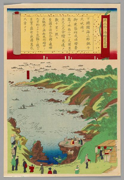 Utagawa Sadahide created this woodblock print, ‘A Distant View of Yokohama’, using ink and color on paper. The composition is immediately striking, with the scene framed by two towering rock formations, creating a natural proscenium. The use of perspective compresses the landscape, leading the eye towards the distant horizon line. Sadahide employs a limited palette, dominated by blues and greens, to evoke a sense of tranquility, contrasting with the intricate detail of the landscape below. He constructs a complex interplay of visual elements arranged to destabilize a singular viewpoint. The elevated vantage point, combined with the framing device, prompts questions about the act of seeing and the power dynamics inherent in observation. The print challenges fixed notions of space and perception, positioning the viewer as an active participant in constructing meaning. Through this framework Sadahide encourages us to look more critically at the structures that shape our understanding of the world.