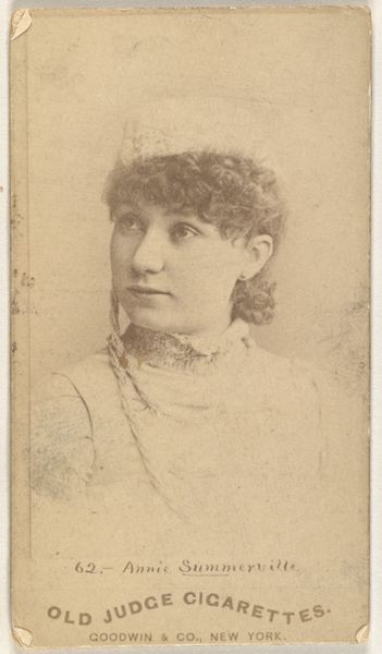 This card featuring Miss Mather from the Actresses series was produced by Wm. S. Kimball & Co. Notice the lace collar, a delicate yet assertive band that encircles her neck. In earlier times, such collars were worn as symbols of status and modesty, yet here, encircling the throat of an actress, the collar takes on a theatrical dimension. I am reminded of the ruffs in Renaissance portraits, signaling nobility and power, but those stood apart from the body, creating distance. This collar, in contrast, suggests a form of constraint, a visual tension between the actress's profession, which demands openness and exposure, and societal expectations of a woman's proper place. Such a symbol is not static; it evolves, reflecting cultural anxieties and aspirations. This very tension plays out on the stage, as it does in life, engaging us on a deeply psychological level.