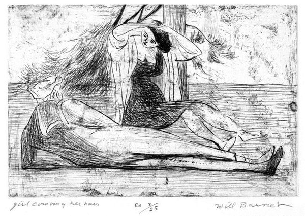 Curator: Ernst Ludwig Kirchner’s “Reclining Woman,” currently housed at the Harvard Art Museums, is a compelling work on paper measuring roughly 50 by 60 centimeters. Editor: It's striking how Kirchner uses stark black and white to convey a sense of weariness, even vulnerability, in the figure. Curator: Absolutely, and understanding Kirchner’s involvement with the Die Brücke group, we can see how his engagement with printmaking allowed for a wider dissemination of his aesthetic and political views. Woodcuts and lithographs were relatively inexpensive to produce. Editor: Which also democratizes art, making it accessible to a broader audience, challenging traditional hierarchies of patronage and display. We see the woman almost collapsing under societal pressures and expectations. Curator: That is well said, and it draws attention to the socio-economic contexts that facilitated the circulation and reception of his imagery. Editor: It encourages a dialogue between art history, gender studies, and social critique. I leave with more to consider about both artistic production and its role in reflecting societal anxieties. Curator: As do I, the way that he combined form and means of distribution makes it more thought-provoking for me.