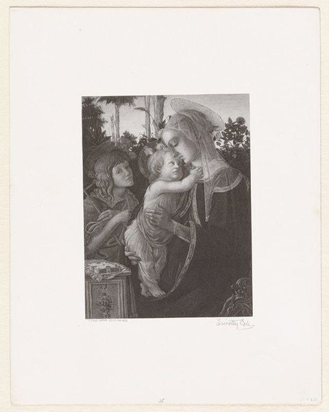 Curator: The work before us is a reproduction by Paolo Toschi, active in the 19th century. It is called "Redemptor mundi" and resides here at the Harvard Art Museums. Editor: It's so delicate, almost ethereal. The subdued palette gives it a dreamlike quality. Curator: The iconography is fascinating. Christ, supported by angels, isn't quite dead, but suspended between worlds. This image had a powerful effect on religious and political culture in Europe. Editor: The angels, so tenderly cradling Christ, suggest comfort and hope. The whole composition is designed to evoke compassion. Curator: Indeed, images of Christ as "Redeemer of the World" were often employed to reinforce specific doctrines and the Church's authority. Editor: And here it's softened. Its visual language speaks to universal themes of sacrifice and salvation, independent of dogma. Curator: Interesting, isn't it, how interpretations shift depending on the viewer's perspective and the context? Editor: Absolutely. The visual symbols retain power, even as their meaning adapts.