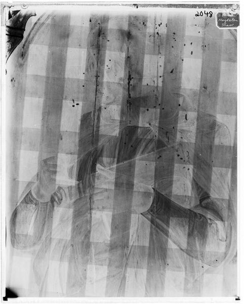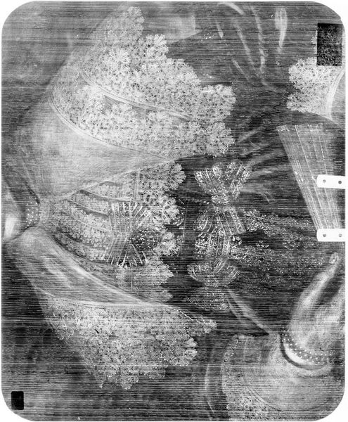 Editor: This is an X-radiograph of "Holy Family", by Jacopo Palma. It’s fascinating to see this behind-the-scenes view. What do you see in the radiographic composition? Curator: The x-ray reveals the artist's process: pentimenti, reworked passages, a palimpsest of forms. The stark contrast elucidates the density of the pigment and its application. Editor: So, the visible changes tell a story of the painting's evolution? Curator: Precisely. Note how the artist has adjusted the placement of figures, the drapery, and even the light, seeking a more balanced composition. Editor: It's like archaeology of art! Curator: Indeed. Radiography allows us to analyze the artist's structural decisions and appreciate the materiality beyond the surface aesthetics. Editor: I never considered the composition in such depth; it really changes how I view the final work.
