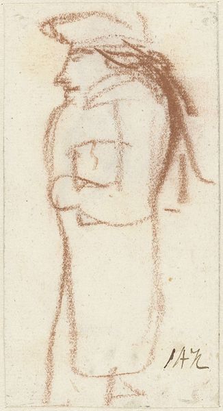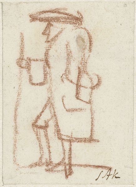 Curator: Here we have “Lopende man, naar links, van opzij gezien,” or "Walking Man, facing left, seen from the side," by Simon Andreas Krausz, created between 1770 and 1825, a pastel drawing. What strikes you about it? Editor: Initially, I’m drawn to the sketch-like quality. It feels very immediate, as if we’ve caught the artist capturing a fleeting observation. Curator: I find that immediacy compelling as well. Consider the socio-political context; the late 18th and early 19th centuries saw enormous upheaval, the French Revolution, the rise and fall of Napoleon. The very notion of ‘man’ was being challenged and redefined in revolutionary terms. This almost gestural capture feels relevant to this moment in European history. Editor: Yes, it lacks the grandiosity of the Neoclassical, perhaps because it captures movement itself. The looseness speaks to something more grounded, something personal perhaps, reflecting an era grappling with shifting ideals of personhood and identity beyond mere representation. Curator: Precisely. And Krausz worked during a period when art academies and institutions were solidifying power dynamics within the art world. However, here we have this wonderfully vulnerable and transient piece. It's in stark contrast to the idealized portraits commissioned to serve specific social and political purposes. What of the medium? Pastel can lend a delicacy or boldness, right? Editor: Absolutely. In this case, the use of pastel lends a fragile quality, appropriate considering the theme. It accentuates the precarious nature of existence and the era itself. Curator: How does it resonate, given our current socio-political climate? Editor: I feel an undeniable sense of shared struggle and journey— a poignant echo through time. His path is, in essence, a path we’re all on together, grappling with social change, personal transformation. Curator: I find myself contemplating how our institutional frameworks continue to mold our perception of figures walking into and out of the picture plane—the public eye and the historical canon. This man's anonymous march serves as a quiet, defiant counterpoint. Editor: It's fascinating how a seemingly simple sketch can open up layers of thought. Curator: It’s pieces like these that invite us to constantly re-evaluate our understanding of art and its connection to history and contemporary experience.