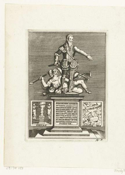 Curator: This engraving from between 1688 and 1690 depicts a "Statue of the Duke of Alva," an image from a printed book now housed in the Rijksmuseum. My first thought is how much political calculation went into even just creating a symbolic representation like this. Editor: I'm immediately drawn to the medium itself—it's a print. Given its existence in book form, this image was likely designed for fairly wide circulation. The materiality of print lends itself to propaganda, doesn’t it? Curator: Absolutely. The Duke of Alva, a controversial figure, standing over defeated figures... this wasn't just a neutral portrait. It actively attempts to construct and perpetuate a certain narrative about his power. Consider the labor involved—the engraver's skill transforming an idea into a reproducible image meant for dissemination. Editor: The choice of engraving seems intentional, offering stark contrasts and sharp lines, mirroring the Duke’s supposedly firm rule. You see those vanquished figures at the base of the statue—and it looks as if Alva literally steps on the people. Who exactly crafted this image, and under whose directive? Understanding their social positioning could unravel even more of this piece. Curator: It's unsigned, but that's part of the point, isn't it? It functions almost like an official decree, the artistry subsumed to the message. Editor: What I find compelling is the distance. The artwork dates over a century after Alva's original statue. It reminds us that even in printed, reproducible form, imagery surrounding powerful figures could be a controlled, constructed projection. It suggests not only historical agency but also enduring debates over legacy and authority. Curator: This little print opens up so many pathways into understanding the public role of art in shaping historical memory. Editor: It pushes me to reconsider the means by which those narratives get made. Even the finest engravings, made for mass production, hold a trace of the material conditions under which they were produced, as well as clues about Alva's place in Dutch cultural memory.