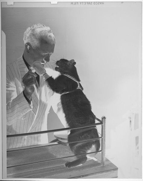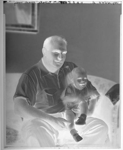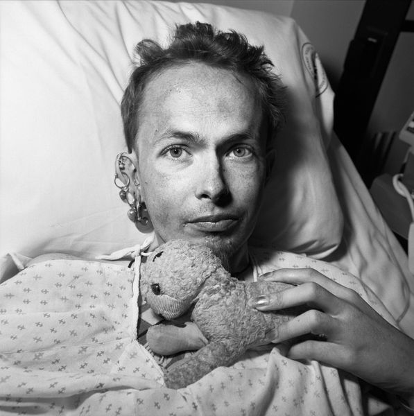 Curator: This black and white photograph from 1993 is titled "Dewain Belgard" and the work of Nancy Andrews. It features a close portrait of a man, eyes closed in obvious delight as a dog affectionately licks his forehead. What strikes you first about this work? Editor: I'm immediately drawn to the tenderness radiating from this image. The contrast of the textured leather jacket against the soft fur, the tight composition—it’s intimate and almost universally relatable in its depiction of human-animal connection. Curator: Indeed, the imagery here operates on multiple levels. Consider the dog itself. It’s not merely a pet; across cultures, dogs often symbolize loyalty, protection, and unconditional love. Its presence transforms this portrait from a study of an individual into a broader statement about companionship and interspecies bonds. Editor: I agree. It reminds me of the historical tradition of depicting animals alongside important figures in art, not just as accessories, but as signifiers of virtue or status. In this context, the dog elevates the sitter. I'm curious, however, about the choice of black and white. It certainly steers clear of sentimentality in its focus on shape and light, yet one cannot help but wonder why color was removed from the equation here? Curator: The use of monochrome removes distraction. By stripping away the colors, we focus squarely on the emotive exchange, the palpable joy, the interplay of light and shadow upon their faces, the textures. Andrews guides us towards understanding the essence of affection stripped down to its primal form. It universalizes the feeling by removing specifics of time and place through de-saturation. Editor: Fascinating. Thinking about contemporary portraiture, this image prompts me to reflect on how we publicly portray relationships, particularly in our hyper-mediated society. How do representations like these influence public perception of such intimate moments? Is there almost an archetypal simplicity conveyed, amplified even through its contrast of light and dark that might resonate universally with an audience, regardless of background? Curator: Precisely! It also serves as an interesting cultural artifact. We get insight into the evolving aesthetics of how relationships are framed and projected. So what are your concluding impressions? Editor: Ultimately, beyond a personal moment, the photograph’s power lies in capturing an honest depiction of connection—between species, between individuals and perhaps prompting introspection for viewers about relationships. Curator: An exploration of love and loyalty—rendered timeless through the conscious selection of light, texture, and symbolism.