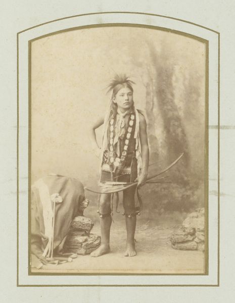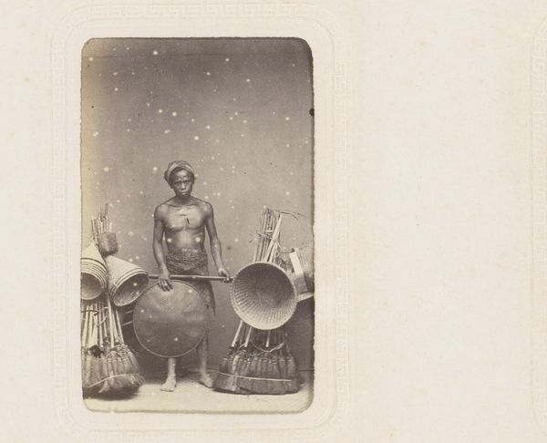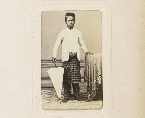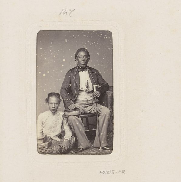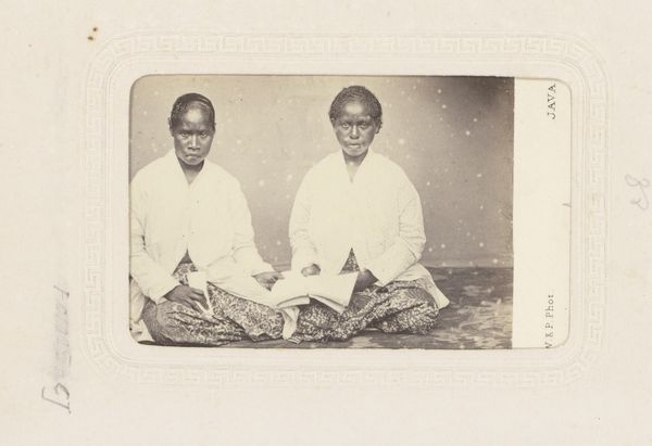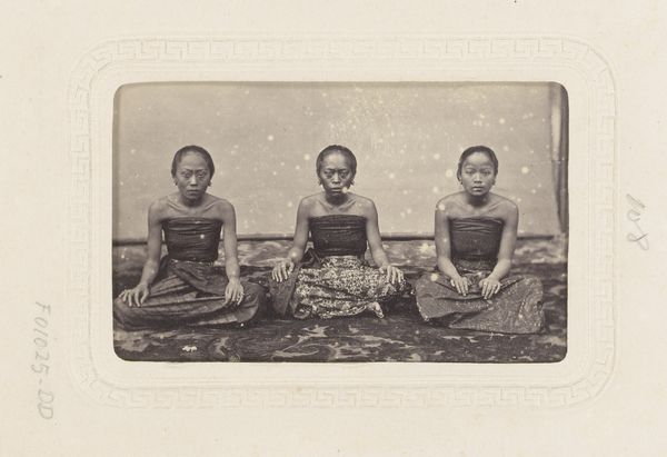 Editor: This is a photograph entitled "Portret van vermoedelijk een bediende van Hamengkoeboewono VI met twee kinderen," created between 1857 and 1880 by Woodbury & Page. It's an albumen print, currently held at the Rijksmuseum. I'm immediately struck by the formality of the composition, and the direct gazes of the subjects. What social dynamics do you think are at play here? Curator: That's a great question. Considering its context, Java during the colonial period, we must unpack the power dynamics inherent in such a portrait. It's crucial to recognize that Woodbury & Page were European photographers operating within a system of colonial exploitation. Editor: So, the very act of documenting these individuals was influenced by colonialism? Curator: Precisely. While seemingly a straightforward portrait, it becomes a complex statement about representation, agency, and cultural exchange. Whose gaze is centered here? What does it mean to capture the likeness of individuals labeled as 'servants' within the framework of imperial authority? What survives of their identity? The children's proximity makes the relationships feel complicated, doesn't it? Editor: Definitely. The backdrop seems very generic, focusing solely on the sitters. I wonder if that adds to the objectification? Curator: It may. Consider also the prevalence of Japonisme and the fascination with Asian art during that era. Could this image be viewed through that lens, as an exoticized depiction of Javanese individuals tailored for Western consumption? Editor: That's fascinating. It makes me question my initial reading of formality. Curator: These photographs provided Europeans with a sense of knowledge and ownership over the colonized world, creating an imbalance of power that persists even today. By recognizing that, we create space to better know ourselves. Editor: I hadn't thought about the enduring legacy of those power dynamics. This gives me a lot to consider about representation and the colonial gaze in 19th-century photography. Curator: Exactly, it’s crucial to think critically about whose stories are being told, and how, in art historical narratives.