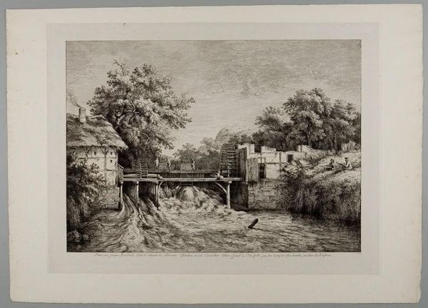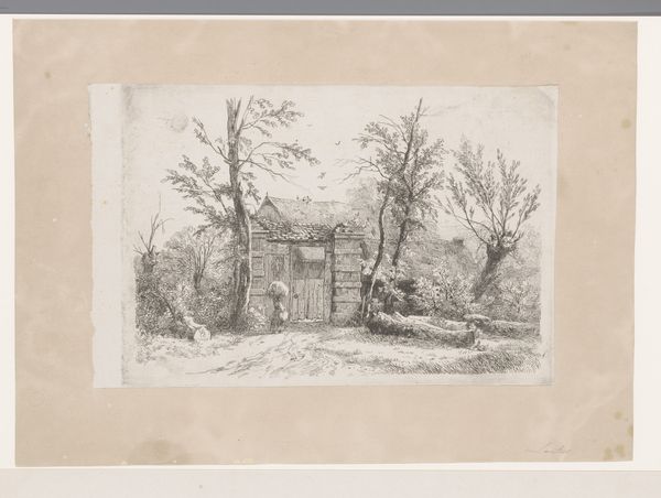 Curator: This is "Entrance to a Forest in Brie" by Jean Jacques de Boissieu, held here at the Harvard Art Museums. Editor: It feels melancholic, doesn't it? The dilapidated structure beside the dense woods... very atmospheric. Curator: Absolutely. Boissieu was a master etcher. Look at the intricacy, how he uses line weight to define the textures of the wood, the foliage. We must consider the social status of printmaking at the time. Editor: And how these images circulated! Boissieu lived through the French Revolution. Was he critiquing rural poverty here, or simply depicting a pastoral scene before industrialization fully transformed the landscape? Curator: Perhaps both. The print, a reproducible object, allowed wider access to these images, shaping perceptions of the French countryside. Editor: It's a stark reminder that even seemingly simple images carry complex histories and material realities.