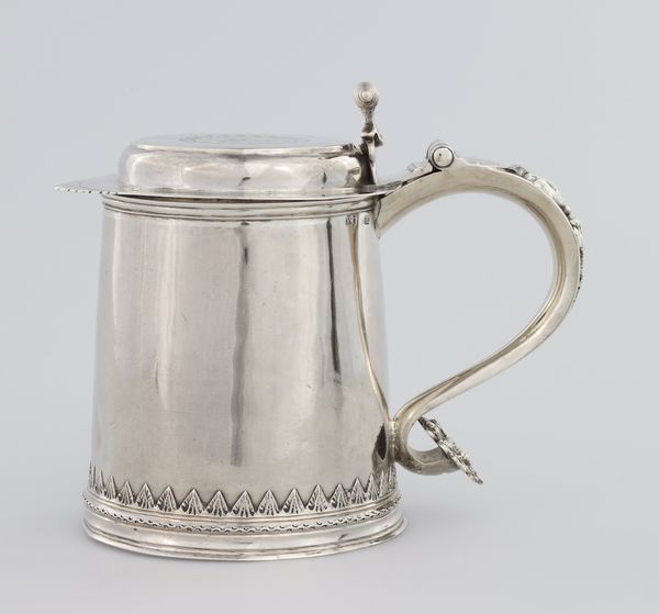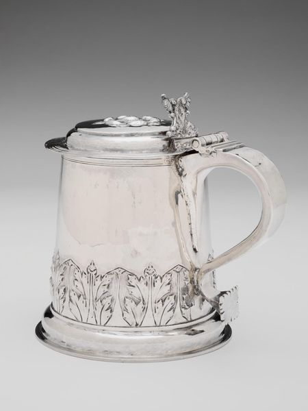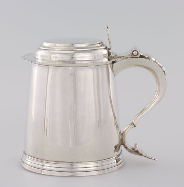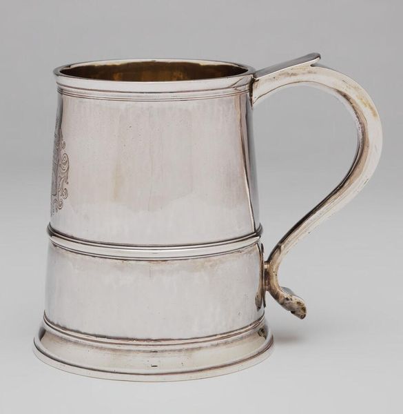 Editor: Here we have a silver tankard, maker’s mark IS with cinquefoil below, at the Harvard Art Museums. Its gleaming, rounded form is quite appealing, but almost severe in its simplicity. What stands out to you? Curator: Note how the cylindrical body and the curved handle interact. The craftsman has meticulously balanced these opposing forms. Observe also how the reflective surface modulates light and shadow, creating an interplay of visual textures. Editor: So you're focusing on the relationship between the shapes themselves? Curator: Precisely. The semiotic reading might consider the relationship between form and function. Consider how the handle’s curve echoes the body’s roundness. The aesthetic appeal lies in this harmonious balance. Editor: I see it now, the balance between those forms is more striking. Curator: Yes. The tankard is more than a drinking vessel; it's a study in form and light.