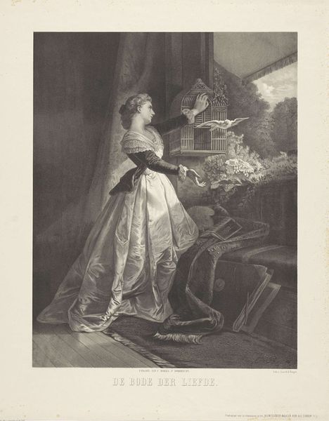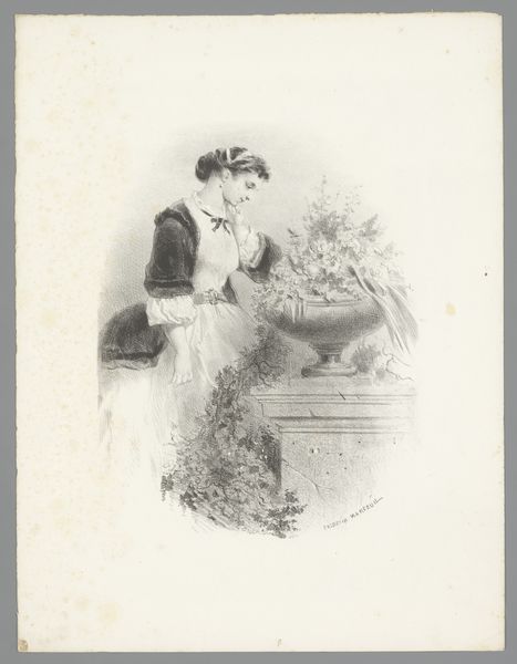 Curator: Here we have a drawing by Célestin Nanteuil, titled "Vrouw kijkend op een landkaart staand naast een tafel," or "Woman looking at a map standing next to a table," created sometime between 1851 and 1865. Editor: The sheer detail achieved with ink on paper is quite remarkable. It immediately conveys a sense of quiet domesticity and perhaps a touch of melancholy, especially given the heavy drapery. Curator: It is Romanticism at its finest. Maps often symbolize journeys and possibilities. What do you make of her studying one? Editor: I see a tension. On the one hand, we have this beautifully rendered, voluminous dress, surely a marker of wealth and leisure. Then we have the map suggesting movement, adventure. Is she longing for something more than her station allows? The material constraints of her life versus the expansive, albeit abstract, possibilities represented by the map. Curator: Precisely. And the plants on the table are very deliberately placed, wouldn’t you agree? They signify growth, aspirations, and even the desire to cultivate a fulfilling life, further intensifying her silent quest. It resonates so well with its themes. Editor: But the act of viewing itself, she's handling the edge with only her fingertip, isn't it? And why a basket under the table, what is that there for, it makes you question a level of labour being depicted, although seemingly hidden, the labour isn't clear and makes one want to examine more closely. Curator: It shows us the everyday details of the moment. But it may hint to constraints around travel in reality as opposed to what a woman may do through reading. In that case, maps act like literature! Editor: Absolutely! There are subtle complexities within Nanteuil’s piece. Curator: And it shows us, too, the silent revolutions of thought. A potent reflection on social and emotional life. Editor: Indeed, it's a beautifully executed drawing that speaks volumes about material comforts alongside inner longing.