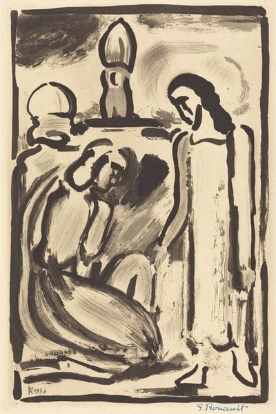 Chet Harmon La More made this image, titled "Unemployed", using lithography. The visible process in this piece is really speaking to me; it’s so raw and immediate. You can almost feel La More’s hand moving across the stone. The colors are muted and earthy, with these pops of blue and salmon that give it a strange tension. Look at the way the figures are rendered. It's like he’s not trying to hide anything, leaving these marks and gestures exposed, like a visual diary of the making process. The layering of colors creates depth and texture, giving the piece a tactile quality. The rough, uneven edges of the forms, the way the colors bleed into each other, it all adds to this feeling of vulnerability and unease. It reminds me a bit of some of the social realist prints from the 30’s, but with a more personal and introspective touch. Ultimately, "Unemployed" embraces ambiguity, inviting us to consider the complexities of human experience.
