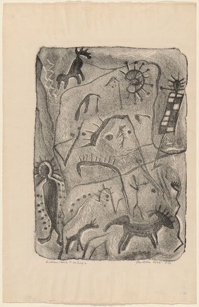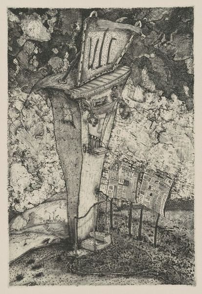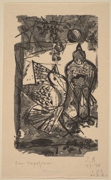 Editor: This is "Der Vogel & Sein Nest," or "The Bird and its Nest," by Imre Reiner, created in 1947. It looks like an etching or perhaps a woodcut. The composition is fascinating; it's quite dense and intricate. What can you tell me about it? Curator: The first thing I notice is the labour involved in producing such a detailed image with etching or woodcut. Reiner painstakingly carved those lines. Consider the economic conditions in 1947—paper, tools, the press—each element represents a financial investment and a conscious decision about the work's materiality. Editor: So, it’s not just about the image of the bird itself, but about the resources needed to even make the art? Curator: Exactly. The choice of printmaking suggests accessibility – prints can be reproduced and distributed more widely than unique paintings. Was Reiner making a statement about democratizing art, or simply working with available and affordable materials? The rough, almost frantic lines might suggest something about the scarcity or urgency of post-war production. Editor: I hadn't thought about it that way. The "sketchiness" gave it a raw feel, but now I'm thinking about the materials he chose and what they say about his priorities at the time. Curator: Think, too, about who this print might have been made for, who it might have been available to. Does this limit its artistic merit, or instead grant it a new level of historical significance? These works challenge traditional boundaries and raise vital questions. Editor: This has totally shifted how I see this piece. I’m now far more curious about Reiner’s resourcefulness and the socio-economic implications behind the choice of materials, rather than just focusing on the imagery of the bird itself. Curator: Exactly, considering how art objects were conceived, made, and used. That’s the critical part of true engagement with art history.
