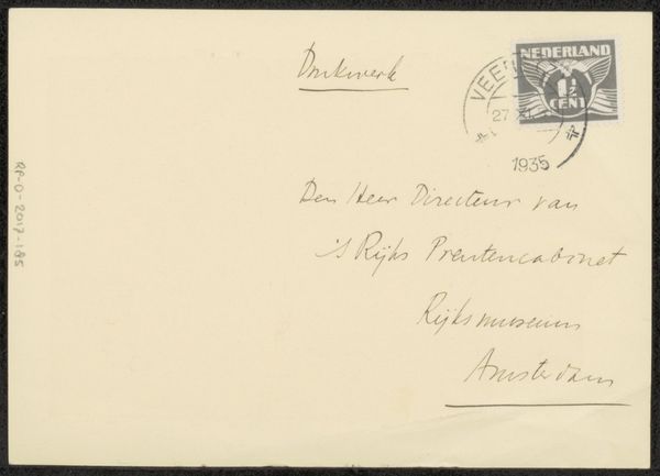 This is an envelope, a letter in fact, from Grada Hermina Marius. It’s an artwork made of paper, ink, and a stamp, addressed to Philip Zilcken. The handwriting, it's not just information; it's like a little drawing, each letter a brushstroke. The way she forms her ‘M’ in ‘Marius’ feels like a gesture, a tiny dance. The stamp and the circular postmarks add layers, like collage, grounding the personal message in a specific time and place. See how the stamp is slightly askew? Imperfect. I love that. It’s like a painting where the artist leaves the drips and smudges—evidence of the process. This reminds me of Hanne Darboven’s work, where she used repetitive writing and calendrical systems. Both artists transform the mundane into something poetic, something that makes you think about time, communication, and the beauty of the everyday. Art, like a letter, is a conversation, a way of reaching out, of saying, "I was here."
