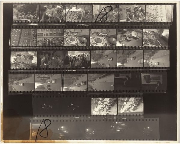 Robert Frank's "Paris 20A" presents a film strip, a sequence of urban moments captured through the lens. In this format, we see multiple scenes simultaneously, each a fragment of Parisian life. The film strip itself, a linear yet fragmented narrative, echoes ancient friezes—the continuous bands of images that once adorned classical temples. These friezes narrated myths and histories, much like Frank's strip narrates the everyday. The sequence invites us to consider how individual moments combine to form a larger story, how our memories are constructed from fleeting impressions. Like the repeating patterns in a tapestry, each frame is a unit that contributes to the overall composition. This repetition taps into our deep-seated psychological need for rhythm and order, yet the varying content introduces the chaos and unpredictability of life. The power of "Paris 20A" lies in its ability to evoke a sense of time, memory, and the ongoing flow of experience. Each glance is both a pause and a progression, and the strip continues, as all things do.