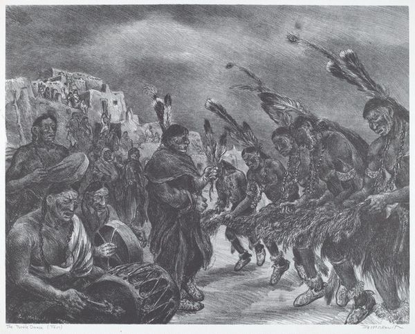 Editor: This is Murray Zimiles' "Roundup at Zamosc." It's a stark, monochrome print with figures conveying immense distress. What can you tell me about it? Curator: The lithographic process is key here. The raw, gestural marks mirror the violence depicted. Consider the materiality of the print itself—paper, ink, the press—as evidence of a process, mirroring the historical process of dehumanization. Does the medium amplify the message? Editor: Absolutely! It makes it feel immediate, less like a detached historical account. It’s almost visceral. Curator: Precisely. Zimiles isn't just representing; he's implicating us in the means by which such events are recorded and remembered. Think about the consumption of this image then and now. Editor: That’s a powerful thought. It gives a new weight to the act of viewing. Curator: Indeed. It prompts us to question how we engage with images of trauma and the responsibilities inherent in that engagement.