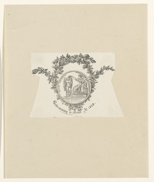 Alfred Alexandre Delauney created this print, "Title page with a overgrown stone with inscription in a forest landscape," using etching techniques. The composition presents a dense forest scene, meticulously rendered with fine lines that evoke a sense of depth and texture. The stone at the center, inscribed with text, acts as a focal point, framed by the organic chaos of the surrounding foliage. This contrast between the structured inscription and the wildness of nature is key. Delauney is staging a play between the human desire to order and label the world, and the uncontainable vitality of the natural realm. The use of etching allows for an impressive level of detail, particularly noticeable in the depiction of leaves and branches. This print destabilizes our usual way of categorizing art. It's not simply a landscape; it's an exploration of how we perceive and interact with our environment. It invites us to consider the relationship between text and image, and between culture and nature.