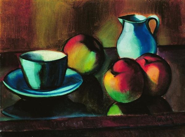 Editor: We're looking at Pyotr Konchalovsky’s “Still Life. Peaches,” painted in 1916 using oil paint. The impasto technique really brings the textures to life. What I find most striking is how the bright fruit practically jumps out from the subdued purples and grays of the background. What do you see in this piece? Curator: Initially, I'm struck by the structural tension Konchalovsky establishes between the organic forms and the geometric underpinnings. Note the carefully arranged peaches and pears against the structured verticality of the stacked cups. The color palette too creates tension: warm hues versus cool tones. The surface appears to vibrate between texture and color. How does this tension impact your viewing? Editor: That's interesting; I hadn't really considered that juxtaposition of organic and geometric forms! The tension between warm and cool is clear, but what purpose might that compositional structure serve? Curator: In focusing on intrinsic elements like shape, color, and arrangement, Konchalovsky highlights their relational impact. He allows us to experience the fruit as *form* first, before its categorization as *fruit*. The composition emphasizes their pure aesthetic presence and invites closer sensory analysis. Don’t you agree that its abstraction brings a certain modernity to a traditional genre? Editor: I do see that. It really breaks down the still life to its core components – shapes, colors, textures – divorced from the narrative we might usually expect. It almost becomes about the act of seeing itself! Curator: Precisely. The essence of the work rests on the way the artist orchestrates these formal qualities, allowing the viewer to interpret based on observation alone. It minimizes external reference, pushing towards a self-contained aesthetic experience. It truly shifts your focus towards its internal formal logic, wouldn’t you agree? Editor: Absolutely! Considering the piece this way provides a richer appreciation for the artist's deliberate choices, shifting my focus from 'what' is depicted to 'how' it’s depicted. Curator: Indeed, the work functions through the interplay of its components, rewarding close and thoughtful inspection of structure.