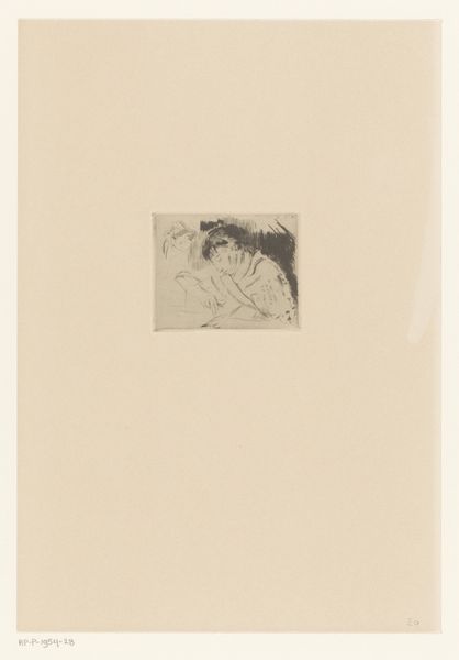 Editor: So, here we have Félicien Rops' "Young Woman with a Fan," created around 1875. It's an etching and print currently held at the Rijksmuseum. It has a kind of ephemeral quality, almost like a dream. What's your take on it? Curator: It's funny you say dream, because it feels more like a fleeting thought, doesn't it? A quick charcoal sketch lifted from a larger, possibly slightly wicked narrative. Rops was so attuned to the undercurrents of society; can't you just imagine the world he inhabited? Are we looking at innocence here, or intrigue, carefully hidden? I'd say definitely intrigue. The fan is less for keeping cool and more for…hiding secrets, wouldn't you agree? Editor: Definitely! The fan does give that sense of secrecy and hidden intentions. I can imagine someone hiding behind a fan while overhearing gossip. How does this connect to his Symbolist leanings? Curator: Symbolism isn't always screaming from the rooftops; here it’s a whisper. Rops uses suggestion rather than outright statement. Think about the fan again – it's not just an object, it represents a barrier, a way to curate the gaze of the world. Is she concealing something, or deflecting unwanted attention? She might be sizing up a potential suitor, while concealing her smirk behind that feathered frond. Editor: So, the symbolism comes from the subtle ambiguity he creates. Curator: Precisely. It is almost like the fan creates the ambiguity. Like a paper wall within this portrait. Editor: It really changes my initial impression. What seemed fleeting and light now feels heavy with hidden meaning. Curator: That is the joy of art. Let us both never hide behind a fan again.