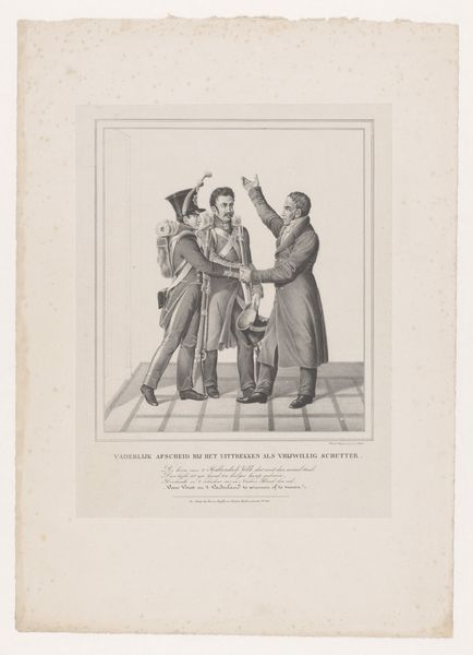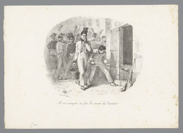 Curator: Ah, yes, this lithograph by Nicolas Toussaint Charlet, dating from 1840. It's titled "Sergeant en schoenlapper met vogelkooi," or "Sergeant and Cobbler with Birdcage," and it's currently housed here at the Rijksmuseum. Quite a charming little scene, wouldn’t you say? Editor: Indeed! Immediately, the contrast strikes me. The sergeant, so upright and formal, against the cobbler, perched precariously, fiddling with that birdcage. There’s a wonderful tension created through the figures alone. Curator: Well, beyond the superficial visual appeal, it's vital to recognize the sociopolitical commentary at play. Charlet frequently depicted scenes from everyday life, often focusing on the lives of ordinary people. Look closely: This juxtaposition serves to highlight the stark class divisions prevalent in 19th-century French society. Editor: I concede the potential social narrative, but my attention is drawn to the use of line. See how the lithographic technique captures the nuances of light and shadow, delineating form while retaining an expressive, almost gestural quality. The very materiality of the print—the paper, the ink—contributes to the artwork’s overall texture and impact. Curator: The mass production afforded by lithography undoubtedly played a part in democratizing art, bringing images like this, and perhaps the implicit social criticisms within, to a wider audience beyond the elite salons. Notice also the cobblestone setting itself; this could well be one of the backstreets, or semi-rural communities where these social divisions were perhaps more palpable. The material conditions of production shaped its dissemination. Editor: Perhaps. Yet, consider how the carefully constructed composition guides the viewer's eye. The way the diagonal of the cobbler's stance mirrors the slant of the shed roof. Note the recurring geometric motif—rectangles forming doorways, windows, the birdcage itself—establishing a structured rhythm within the scene. Even the placement of the figures is a balance, a silent equilibrium on the picture plane. Curator: Balance… perhaps. I read something more challenging than mere 'equilibrium'. Observe the inscription at the bottom. It’s the key here, and underscores a sentiment about what one earns honestly compared to something ill-gotten, driving home Charlet's social critique in readily consumable form. He's not merely capturing appearances. Editor: An interesting interpretation. Looking closer at the printed inscription does indeed add another layer. Still, I’m impressed with the ways in which formal arrangements operate irrespective of the intended subject matter. The aesthetic relationships at play give it… weight. Curator: I see your point. Ultimately, it’s how Charlet, through both his representational choices and printing method, engages with the world around him that makes this more than just ink on paper. Editor: Indeed. The artwork offers layers of engagement through its intricate patterns as well. A piece that benefits from, even demands, a closer look.