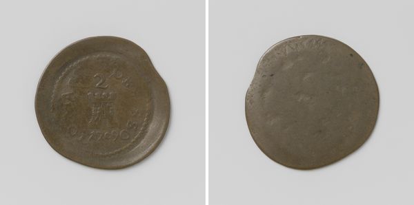 Editor: This object is an eight-stuiver coin, a type of emergency money from Doornik, likely dating back to 1709. It was struck by Marshal de Surville when the city was occupied. The design is quite worn, and it's made of some kind of base metal. What do you see in this piece? Curator: It’s a fascinating example of the intersection between political power and everyday life, isn't it? We often forget that even something as mundane as currency can become a potent symbol of resistance or occupation. The coin, born from the necessities of war, speaks volumes about identity, resilience, and the financial pressures placed on ordinary citizens. Editor: Resilience in what way? Curator: Think about it: the fact that they were striking their own coins means they maintained some autonomy, some defiance, in the face of allied occupation. It raises important questions about who controls the narrative, the economic landscape, and ultimately, the very fabric of society in times of conflict. This isn’t just a piece of metal; it's a document of lived experience under duress. Does that give you any different feelings about the work? Editor: Absolutely. Seeing it as an object that signifies an assertion of power even while occupied is very insightful. Curator: Precisely. And considering how many contemporary conflicts center on controlling resources and economic infrastructure, it reminds us of the cyclical nature of history. Editor: I’ll never look at a coin the same way again! Thanks for the interesting points! Curator: My pleasure! It's about understanding that every object, especially something this charged, carries the weight of history, identity, and struggle.