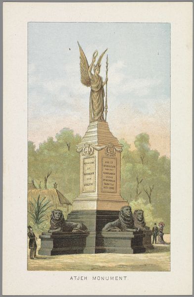 Editor: This gelatin silver print, "Gezicht op het Niederwalddenkmal bij Rüdesheim am Rhein" by Jacob Hilsdorf, appears to be from between 1890 and 1910. The monument depicted really dominates the composition. I'm struck by the scale of the monument in contrast with what seems to be a regular-sized tree line at the bottom and top of the print. What can you tell me about this piece? Curator: It's interesting to consider this image as more than a simple record of a monument. The Niederwalddenkmal itself was completed in 1883 to commemorate the unification of Germany, which makes Hilsdorf’s image a later reflection on that national narrative. Think about how photography was used at this time to construct and reinforce ideas about national identity. What does the careful framing and the slightly elevated perspective suggest to you about the photographer’s stance in relation to that narrative? Editor: So it's not just about showing the monument, but also reinforcing its message of national pride? Curator: Precisely. The monument, with Germania at its apex, embodies a particular version of German identity rooted in military victory and imperial ambition. This was a period of intense nationalism across Europe. The photograph freezes that moment, turning it into a timeless symbol. Consider the figures and their expressions in the frieze... What feelings do you experience? Does it generate patriotism, or critical analysis? Editor: I can see how that could be problematic in retrospect, considering later historical events. Curator: Exactly. And this is where we can start to unpack the complexities of national monuments and their representation. Hilsdorf's photograph invites us to consider not only what is being celebrated but also who is being included, excluded, and how those narratives are maintained and challenged over time. The stark sepia tones feel…serious, reinforcing a sense of historic, almost sacred weight. What did you take away from this discussion? Editor: I never considered photography as active reinforcement for potentially troubling national identities. I'll be sure to think critically next time! Curator: And I now have a renewed perspective on the quiet power held by landscape photography to embody complex social messaging. Thank you.