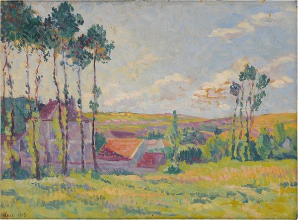 Georges Seurat created this landscape painting, Au Bord Du Village, with oil paint on canvas. He has clearly spent time considering how the application of paint can generate certain visual effects. Seurat was a meticulous craftsman, known for his pointillist technique. This involved building up an image from thousands of tiny, distinct dots of color, methodically applied. This painting is not as refined as some of his other pointillist works, but one can still see how each small dab of pigment contributes to the overall effect. There is a real tension here between the precision of the technique and the more free-flowing brushwork. The effect is quite remarkable. The paint surface shimmers with light, and the landscape seems to vibrate with life. There is an optical mixing of colors that occurs in the viewer's eye, which means we are actively participating in the painting's creation. Seurat elevates the status of craft through his attention to the painting process, inviting us to look closely and consider the labor involved in creating such a unique and captivating work of art.