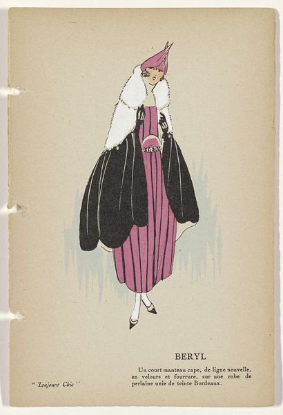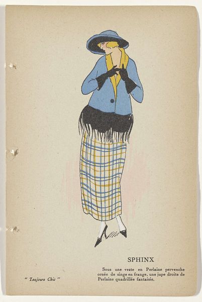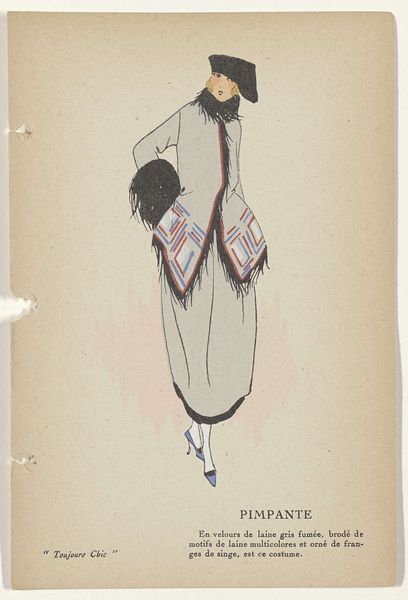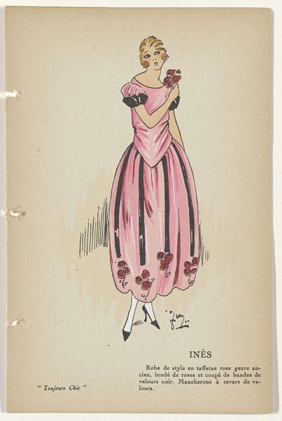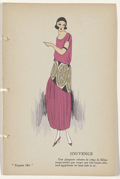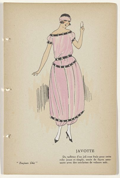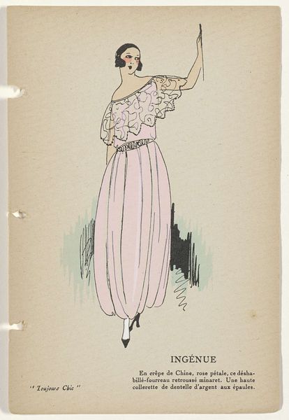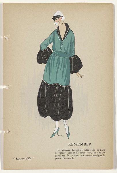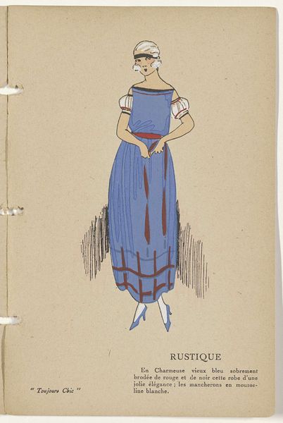 Editor: This is "Toujours Chic Les Robes, Hiver 1921-1922: Océan" by G-P. Joumard, made with ink and watercolor on paper. I'm really drawn to the streamlined shape and the cool palette. It’s almost like looking at a memory of a dress rather than a realistic depiction. What catches your eye when you look at this piece? Curator: Ah, yes, "Océan"! What entrances me most is that precise tension between modernity and nostalgia, isn’t it? Joumard’s economy of line – that confident swoop of ink to suggest an entire silhouette. But then, you sense, beneath it all, an echo of Belle Époque romanticism yearning for simpler forms. The blue ink feels apt considering the title - Océan, ocean. What do you make of the fabric, the *jupe evasee en velours noir*? It grounds it for me somehow. Editor: It definitely gives the whole image more weight. I was thinking about the way the fashion industry was changing during that time, moving away from the fussier styles. Curator: Exactly! It’s an age finding its feet. Observe the simplified color palette, and her cropped hairdo... Do you get a sense of how audacious it was during this post-war era to depict women shedding their constraints both physically and sartorially? This image whispers of freedom. Editor: It does! I hadn’t really thought about it in that light. So much expression is conveyed with so little detail. Curator: Right! Consider Joumard less an illustrator, and more an editor of essence! Every line, colour – or absence of colour – is a considered punctuation mark within this visual poem. It allows us space for individual interpretation of modernism in fashion, as opposed to merely its visual replication. Editor: That's a fascinating perspective. It's like he's offering us a glimpse into the spirit of the time. I'll never see fashion illustration the same way again! Curator: I concur entirely; to see beyond the dress itself is always the point, don’t you think?