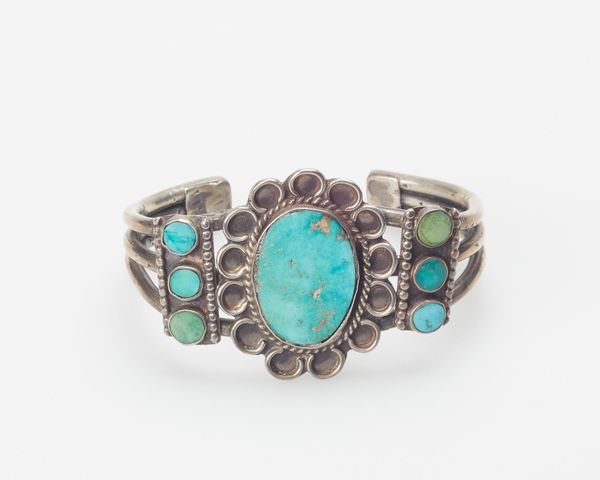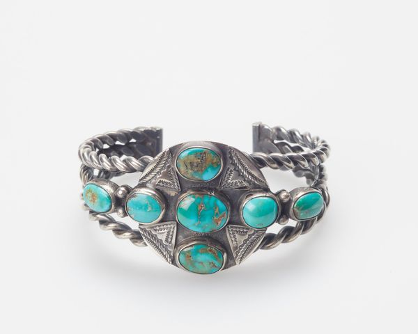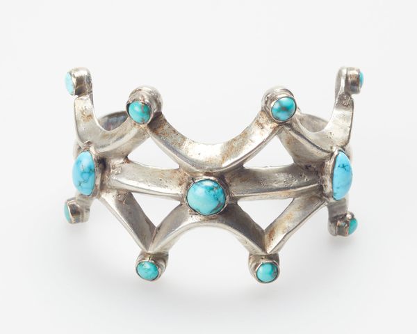 Curator: Here we have a silver bracelet crafted by a Navajo artist, sometime before 1925. It resides here at the Minneapolis Institute of Art. Editor: My immediate impression is its arresting design – a stylized star punctuated by those mesmerizing, small turquoise stones. There's a powerful but understated presence to it. Curator: Absolutely, the bracelet, beyond its aesthetic value, speaks to broader issues of identity and representation of indigenous cultures in the United States. Editor: Let’s not overlook the central star motif. Throughout Navajo cosmology, the star represents a connection to celestial realms and a guide for safe passage. That rich cultural significance informs our understanding of this object. Curator: Right, we can trace that symbolism and how that intersects with issues of cultural appropriation during this era. The rising popularity of Native American designs amongst non-Native populations needs to be analyzed considering power imbalances. Editor: And the turquoise – consider its significance across numerous cultures, a talisman warding off negativity, promoting well-being. Each stone carefully placed seems deliberate, lending deeper layers of meaning. Curator: That's a compelling point. Examining the labor involved, we can connect this piece to conversations about indigenous artisans being undervalued for their creations. Considering the historical context allows us to see beyond just adornment. Editor: Indeed. The metalwork itself echoes enduring traditions. It tells a story of resilience and adaptability. How materials and design evolve and express resistance or affirm ancestral connections within a social matrix is profound. Curator: What I appreciate is how the artist utilizes this visual vocabulary to navigate complex sociocultural spaces, commenting on assimilation while preserving cultural integrity. Editor: Ultimately, this bracelet epitomizes both visual and intellectual exploration, bridging artistic expression, enduring symbolism, and sociopolitical relevance. Curator: And for me, I’m always struck by the enduring power that an artifact has to prompt critical dialogue about how histories, even those that are hard to discuss, impact the present moment.