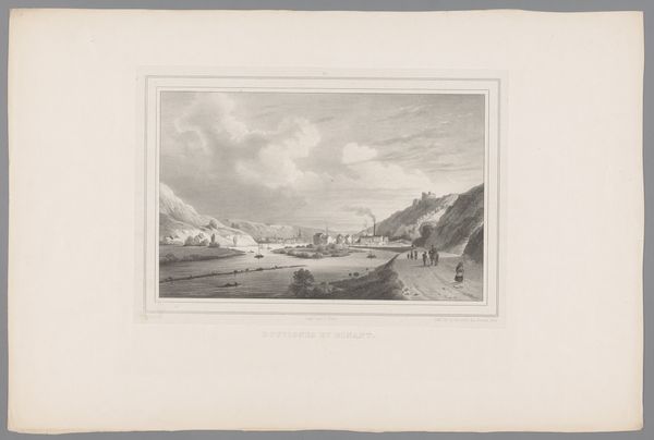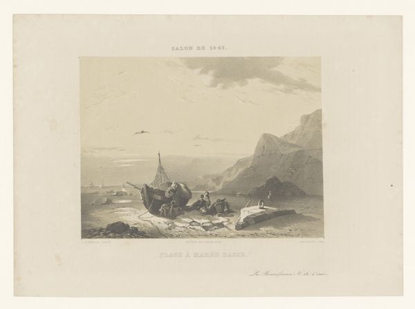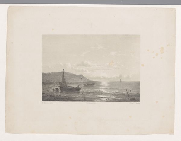 This is Louis-Julien Jacottet’s lithograph, ‘Zicht op de haven van Mölle’. It presents a panoramic view of Mölle harbor, dominated by a subdued palette of greys and whites, creating a serene, almost melancholic atmosphere. The composition is structured by a strong horizontal axis of land and sea, bisected by the vertical masts of the ships. Jacottet masterfully uses line and texture to define forms, from the rocky coastline to the billowing clouds. The meticulous details invite a semiotic reading. The ships, for instance, symbolize trade and travel, while the figures along the shore suggest a human connection to the landscape. The restrained color palette, typical of lithography, reinforces a sense of distance and objectivity, inviting the viewer to contemplate their relationship with the scene. Ultimately, this work functions as more than just a picturesque view. It engages with broader cultural ideas about nature, industry, and the human experience. It also reflects the artist’s engagement with the visual and philosophical discourse of his time.