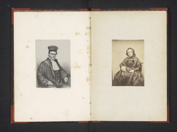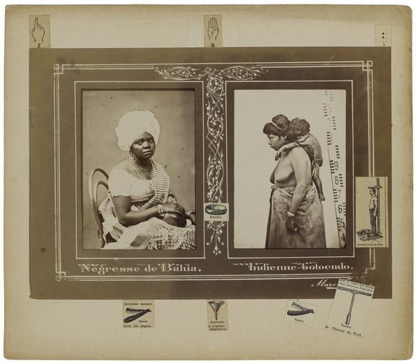 Curator: Oh, this makes me feel strangely uneasy… almost like witnessing something I shouldn’t see. Editor: What we're looking at is an albumen print from before 1884 titled "Vrouw met een borsttumor," which translates to "Woman with a Breast Tumor." This image, presented in the academic style typical of its time, is a part of a larger photographic series. Curator: "Academic" is such a sterile word for what is, essentially, a very raw, very human image. It captures so much suffering. You know, the first thing I noticed, besides, of course, the visible tumor, is the pattern on the wall behind her. It makes the picture feel both intimate and strangely staged, like an uncomfortable play. Editor: Yes, that’s interesting. I see a deliberate compositional choice here. Note the oval frame isolating the woman on the left page, contrasting with the stark square framing of the image on the right. This juxtaposition encourages a comparative analysis, foregrounding the medical before-and-after narrative. Curator: Narrative is the key here, don't you think? The photograph isn't just about documenting; it is also about the human experience. I wonder about her life, what her family thought… what she thought. Did she ever imagine someone centuries later would be contemplating her like this? I feel a connection to this woman; an almost immediate wave of empathy hits me. Editor: Precisely! Semiotically, the stark contrast in lighting, the subject's stoic gaze, it all signifies a kind of clinical observation elevated to historical record. Also, notice the deliberate blanking-out of the woman's face in the photo to the right. The procedure has masked the woman further – which, if anything, gives the woman to the left further potency. Curator: Right. It depersonalizes her in a way. Taking it all in, the contrast really hits me in the gut; that photograph holds within it pain, but it equally sings the courage and dignity that even medical study can't remove. It makes one meditate about vulnerability and, weirdly, immortality; to be here for such reflection far beyond the camera flash seems like triumph against mortality, even a victory. Editor: Agreed. The photograph prompts crucial conversations about medical representation, and, at a deeper level, raises interesting insights into visual language during the 19th century, showing the dynamic interplay of image, history, and meaning.