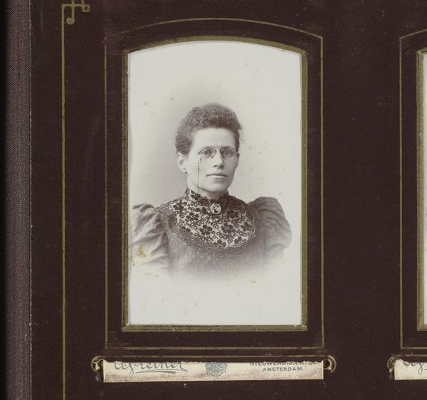 Editor: This is "Portret van een vrouw," a photograph, by Idanus Hendrikus Slaterus, made sometime between 1873 and 1909. It's such a muted piece; everything seems very linear and contained. How would you interpret this work? Curator: Focusing solely on the image's formal properties, I find the use of light and shadow particularly striking. Notice how the high-key lighting washes out much of the detail in the sitter's clothing, yet simultaneously accentuates the precise contour of her face and neck. It draws your attention directly to her gaze. Editor: So you're saying the almost ethereal quality highlights her direct gaze, even though the photographic technology wasn't as sharp back then? Curator: Precisely. It also brings our attention to the internal frame which contrasts with the plain style in the depiction of the model. Furthermore, the limited tonal range simplifies the form. Do you observe any other compositional choices that strike you? Editor: I notice the rigid symmetry of her hairstyle mirrors the vertical framing, which emphasizes her stoic expression. This makes it hard to grasp a specific narrative about the subject. Curator: Indeed. Slaterus, in restricting the dynamic range, and working only within this tight visual structure creates something very contained. Do you think a contemporary viewer would read it similarly? Editor: That’s an interesting point. Probably not, we're trained to look for, or even expect narrative. Now I see how my own expectations are being challenged by the simplicity of form. Curator: Considering just its inherent visual architecture lets one perceive the true intent. Focusing our reading to its shape helps distill a work to its original and essential components.