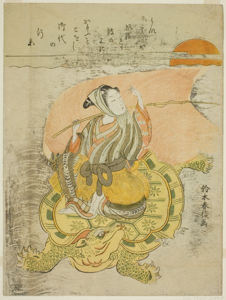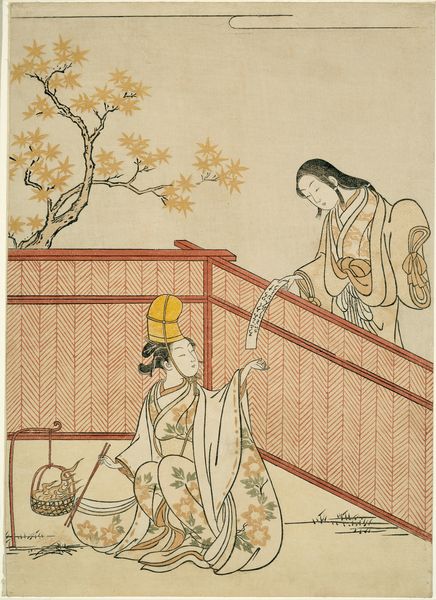 Curator: Let's delve into this woodblock print, "Gathering Lotus Flowers," crafted around 1765 by Suzuki Harunobu. It is currently held in the Art Institute of Chicago. What strikes you first about it? Editor: The delicacy of the scene, immediately. The light palette, the serene expressions of the women, it all evokes a sense of gentle beauty and understated emotion. The lotus flowers, especially, are quite captivating. Curator: Ukiyo-e prints like this one often depict scenes from daily life, particularly leisure activities. Harunobu was a pivotal figure in perfecting full-color woodblock printing, which revolutionized the genre and allowed for richer visual storytelling aimed at wider audiences than previously possible. Editor: Absolutely, the lotus, as we know, carries profound significance in Asian cultures, symbolizing purity, enlightenment, rebirth. Seeing the women reaching for them, I wonder about the emotional and spiritual resonance these flowers held for them, beyond their mere beauty. What would gathering lotus flowers communicate about social class in this era? Curator: The depiction of women engaging in what appears to be leisurely flower-gathering certainly speaks to evolving roles. In Edo society, images of idealized femininity and the floating world provided a form of escapism and offered alternative, and sometimes subversive, visions of life. Editor: Looking closer at their kimono patterns and hair ornaments, it feels as if there is encoded information about their roles in society or even the season being depicted. One woman is actively gathering, while the other steadies the boat, there's a silent cooperation and interdependence, right? Curator: Indeed. Also, it's important to note that prints like these circulated widely and became affordable to many beyond the elite circles who might have been the only people viewing art beforehand. This meant Ukiyo-e played a vital role in shaping broader public tastes. Editor: I find the print subtly profound. What might seem a simple snapshot of a calm afternoon contains layers of social commentary, aspiration, and, of course, the quiet power of symbols resonating through generations. Curator: Agreed, exploring this print gives us a wonderful glimpse into a fascinating confluence of artistic innovation, social change, and the symbolic power of everyday life in 18th-century Japan.
