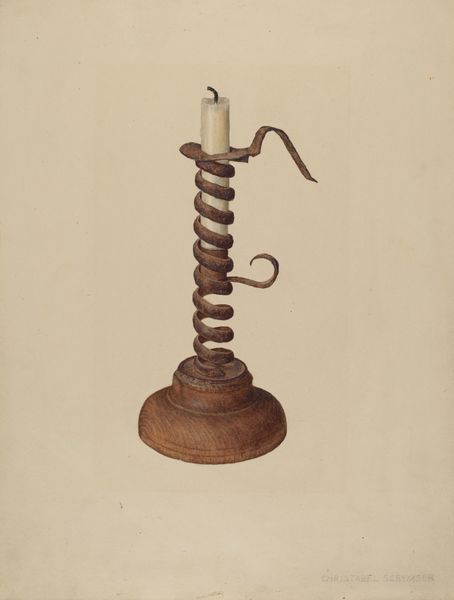 Howard Lumbard made this drawing of a candlestick, we’re not sure when, and it has a simple, pared-down kind of vibe. The controlled palette feels almost like he mixed the colors from mud, there’s something very basic about it. When you look closer at the base, you can see the delicate gradations of tone in the paper, and the way it's been built up, like layers of sediment. The paint is thin, almost watery, and it runs and bleeds into the paper. It’s not really precise, or precious in any way. The whole thing has a bit of a Marcel Duchamp feel, who elevated everyday objects to the status of art. This drawing reminds me a little of Giorgio Morandi, who spent his life painting the same bottles over and over. Lumbard’s piece isn't so much about perfection as it is about seeing, and feeling, the quiet beauty in everyday things. There's no fixed meaning here, just a moment of contemplation, a gentle invitation to see the world in a different way.