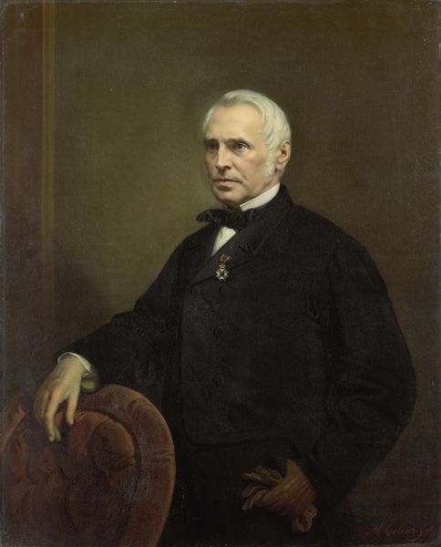 Curator: This is a portrait of Ambrose Lawrence by Thomas Bayley Lawson, currently held in the Harvard Art Museums. Editor: There's a certain reserve in his expression, isn't there? The artist captures a kind of stoic dignity. Curator: Portraits like these were often commissioned to project power and respectability. Lawrence, no doubt, occupied a prominent position in his community. Editor: The somber colors contribute to the gravity. Black suit, dark backdrop—it's about presence, less about personality, I think. Curator: Precisely. Consider the historical context: the rise of industrialism, the shifting social hierarchies. Representing oneself in such a manner was strategic. Editor: So the image served as a cultural symbol—a way of cementing his status. It's fascinating to see how visual cues become shorthand for social standing. Curator: It also speaks volumes about the relationship between art and power. The portrait commemorates not just the man, but the values of his time. Editor: Definitely. A reminder that even seemingly straightforward portraits are complex cultural documents.