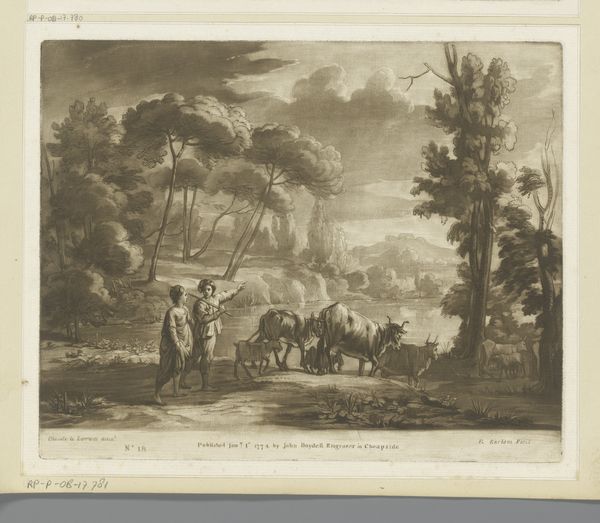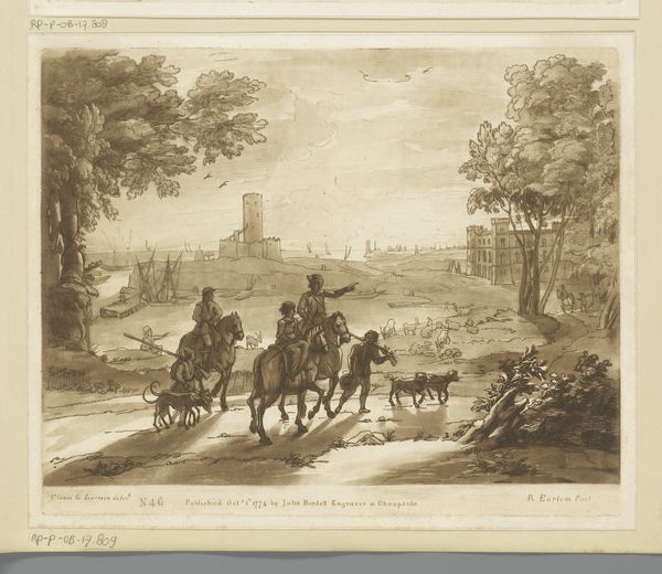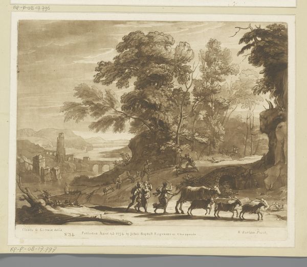 Curator: I find the overall mood so tranquil; a muted palette bathing this pastoral scene in gentle serenity. Editor: We're looking at "Landscape with Cattle Driver over a Stone Bridge", an engraving, possibly from 1774. It's credited to Richard Earlom and currently resides in the Rijksmuseum. Curator: Immediately, the symbolic weight of the bridge strikes me – the bridge representing connection, transition perhaps, within this meticulously rendered landscape. How do you interpret the relationship between those figures in the foreground and the animals moving towards that bridge? Editor: Well, it feels like a visual study of the social hierarchies in the rural setting. Observe how the armed men are placed on the right and seem detached from the everyday realities faced by the cattle drivers who make up the economic backbone of the area. It feels deliberate. Curator: Precisely! And what about the composition itself? It's predominantly horizontal, which, in terms of visual symbolism, conveys stability and continuity, but it feels imbalanced here. How do you think that effects its deeper messaging? Editor: Interesting! The tower could act as a phallic symbol, indicating ownership of the land or patriarchal structures in that society, or an old defensive outpost that recalls memories of previous occupations. Curator: I see it similarly. Thinking about the animals too. Those herds signal notions of property, capital, the very fabric of wealth distribution during the period. Also consider the lack of faces... everyone becomes generalized; economic signifiers of this type of life, or that station. The scene presents more as sociological statement and less a neutral, idyllic snapshot. Editor: So true! And looking at the animals, each with unique burdens on their back...they could be allegories for society during the time period? They almost exist as symbols in themselves! Curator: A fantastic observation. I leave this encounter considering the multiple layers – social dynamics, symbolic imagery – intertwined within this single print. Editor: Indeed! Thanks to Earlom's crafted imagery, we get a unique peek at class divisions that defined countryside living long ago.