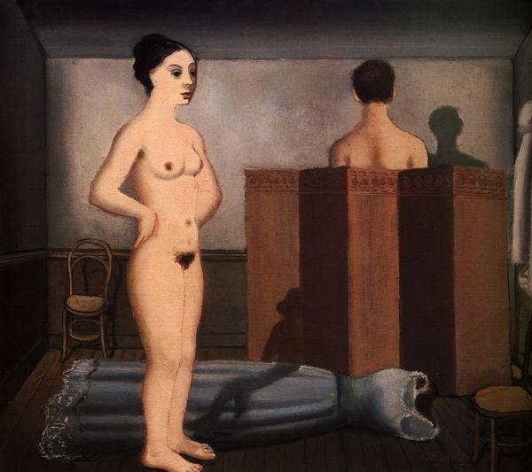 Editor: So, here we have Paul Delvaux's "A Visit," created in 1939 using oil paint. It features two nudes, indoors, bathed in light… I find the stark contrast of light and shadow very compelling, yet unsettling. What formal qualities stand out to you in this composition? Curator: Observe how Delvaux constructs a world ruled by geometry: consider the precise lines defining the room and the bodies. Notice how the lighting, meticulously rendered, interacts with these forms, sculpting the figures and emphasizing their volumetric presence, how this evokes classicism with the strange subjects typical of Surrealism. Does that linearity guide your viewing experience? Editor: Definitely, I notice it more clearly now! The clean lines of the door and walls, juxtaposed with the soft curves of the figures. Also, now that you point out the lighting, I see the distinct areas of highlight and shadow almost dissect the scene into segments. Is there a reason why Delvaux is giving the bodies such sculptural definition in an otherwise dreamlike, or soft image? Curator: Think about the overall structure. Delvaux uses line, light, and shadow to create planes, dividing the composition, to create and underscore tensions and dissonance. But isn't it equally about what these sharp boundaries contain? The bodies. Do you perceive how those planes of light are in contrast to the forms they highlight, thus making it Surreal? Editor: I see. The figures themselves, juxtaposed against the strict geometry, contribute to the dreamlike, almost unreal quality. It’s this contrast that pulls it all together. It certainly challenges my expectations about the traditional nude! Curator: Precisely! We see here a play between traditional form and dream-like abstraction, and how that creates what is a lasting visual tension for the viewer. Editor: Thank you! I definitely look at this painting in a totally new way now. Paying closer attention to his careful manipulation of line and shadow is the key.