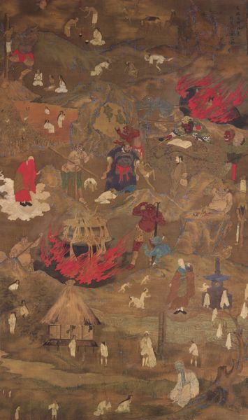 Curator: Erte's graphic print, "Opium/Mah-Jongg," presents a striking visual arrangement. What’s your initial reaction to the work? Editor: The piece feels both opulent and unsettling. The woman's languid pose and the intense masks looming above her are really striking, not only the dramatic contrast but also the overall composition in saturated red and gold tones on a somber backdrop. Curator: Precisely. Note the stark contrast in texture, the flat picture plane against the suggested depth creates tension. What statements might Erte be making by integrating practices like opium smoking and playing Mahjong, within an aesthetic framework? Editor: I wonder about the materiality here. What inks and paper stock would have been used to achieve these deep colors and textures in printmaking? The method would certainly shape how these motifs were perceived in their period. Also, looking at the repeated geometries—considering their roles in manufacturing and in commerce at the time. Curator: A shrewd observation. From a semiotic stance, the figures with expressionless masks seem to signify a loss of individualism under social conformity. They lack specific emotion, emphasizing a unified aesthetic impact. Erte utilizes the geometry not just aesthetically, but as coded gestures of control. Editor: The production details must have added nuance. Imagine those repetitive geometrical forms being carved out. Labor intensivity indicates not only status but the material construction itself. The opulence here cannot be divorced from the system it necessitated. Curator: Erte indeed manipulates motifs, deploying masks and geometry for symbolism and aesthetic charm. Their repetitive arrangement also contributes significantly to its thematic content and narrative intent, drawing the eye into a space of almost dreamlike interpretation. Editor: Ultimately, appreciating its material origin encourages contemplation on craft versus high art, and highlights the complicated relationship between labor, leisure, and status that underpin Erte's compositions. Thank you for elucidating it to me, very useful information!
