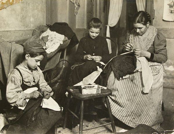 Editor: This photograph by J.H. Adams titled "Women's Detained Room: Writing the First Letter Home" depicts a group of women and children gathered around a table, seemingly writing. The sepia tone creates a somber mood. What do you see in this piece? Curator: This image offers a poignant glimpse into the immigrant experience, specifically the liminal space of detention. It speaks volumes about the regulation and control of bodies at the port of entry. Consider the act of writing itself: a means of maintaining connection, asserting identity, and resisting erasure. What does it mean to be detained while attempting to communicate with 'home'? Editor: It feels contradictory, like a promise of freedom juxtaposed with confinement. Curator: Exactly. The image makes us think about the power dynamics inherent in immigration, the gendering of that experience, and the psychological impact of displacement. It asks us to reflect on who is granted the right to belong and who is not, and how those decisions shape lives. Editor: That's a perspective I hadn't fully considered. Thanks! Curator: My pleasure. Art helps us interrogate these complex histories and connect them to contemporary struggles for social justice.