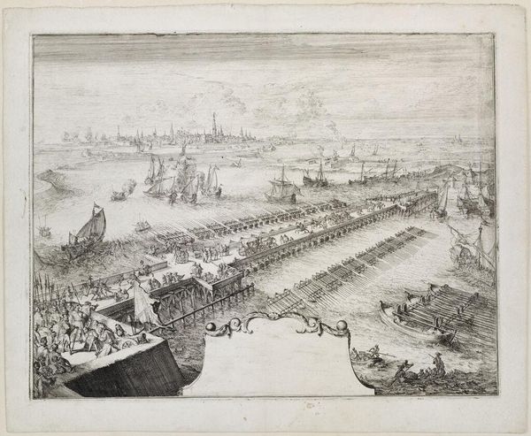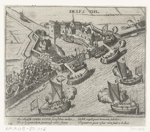 This print, titled "Entry of the Prince of Orange into Brussels," was made in 1577 by an anonymous artist. It is an engraving, meaning the design was incised into a metal plate, likely copper, using a tool called a burin. The fine lines were then filled with ink, and the plate pressed onto paper. The process demands a high level of skill and control, with the direction, density, and depth of the lines creating areas of light and shadow. The print depicts a triumphal procession, in which the Prince is ferried down the canal towards the city. While seemingly celebrating the Prince’s arrival, the linear precision of the engraving process suggests the militarized and rigid societal structures of 16th-century Europe. The print, though small in scale, speaks to the social and political climate that required such careful articulation of power. The print's ability to translate a grand event into a reproducible format shows the growing importance of printmaking as a medium for disseminating information and shaping public perception.