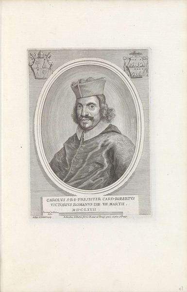 Curator: What strikes me immediately is the intricate nature of this print, titled "Portret van kardinaal Carlo Bonelli," created by Adriaen Haelwegh sometime between 1664 and 1691. It's an engraving, giving it a crisp, formal quality. Editor: The lines are exquisite. You can almost feel the paper’s texture despite the digital reproduction. I’m fascinated by the level of detail that would have gone into carving this, particularly around the cardinal's garments and that fantastic goatee. Did Haelwegh engrave this from a painting? It looks almost like a reproductive print. Curator: Likely, yes. The image would have been reproduced to amplify the cardinal's image, and potentially as a form of political currency. The strategic distribution of his portrait solidifies his place in the church's hierarchy and influence, as you see emblems included around the central portrait. Editor: I can’t help but think about the engraver’s labor. What was Haelwegh’s social standing? How long did this process actually take, and how did this specific kind of artisan contribute to larger systems of production and networks of power at the time? It is a physically demanding and very exacting process, which, from a material perspective, connects labour directly to power and institutional strength. Curator: That’s key to understanding its cultural weight. These kinds of prints were not mass-produced in the modern sense. There’s a deliberate act of curation and circulation here. It suggests that there was an intentional use of the medium and imagery to establish an understanding of a key political figure, imbuing the church with authority. Editor: Right, it speaks to the carefully crafted construction of power through image. Considering that these are visual technologies, can we then also trace this line all the way to how similar kinds of social effects still permeate photography and today's image-based social media practices? Curator: Precisely. The lineage is there, demonstrating a through line across artistic practice. So it’s far more than a portrait. This is also a statement on social, institutional power, and its relationship to art itself. Editor: Thanks, I see how focusing on these details truly expands one's appreciation of this work beyond just its face value as a portrait. Curator: Indeed. By examining its production and social history, we get a glimpse into the cultural values and systems of that time.