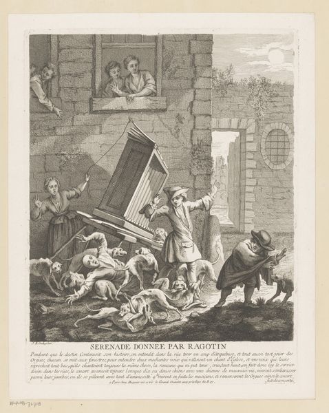 Gabriel Huquier's etching captures a chaotic scene of Ragotin, nude and beset by bees and a dog, a raw, visceral tableau. The swarm of bees, historically symbols of community, diligence, and even immortality, become instruments of torment here. This recalls ancient myths where divine wrath is delivered via stinging insects, a motif echoed across cultures, from the trials of Io in Greek myth to similar punishments in folklore. The attacking dog, a symbol of loyalty turned aggressor, amplifies Ragotin's plight. The image evokes a primal fear, a deep-seated anxiety about the fragility of the human body against the forces of nature. The very act of overturning beehives taps into the subconscious fear of disrupting natural order, inviting retribution. Consider the bee. It has flown through history, buzzing in ancient Egyptian royal symbology and the heraldry of European nobility, each time reborn with new layers of cultural significance. Here, it represents the cyclical nature of transgression and consequence, forever imprinted in our collective cultural memory.