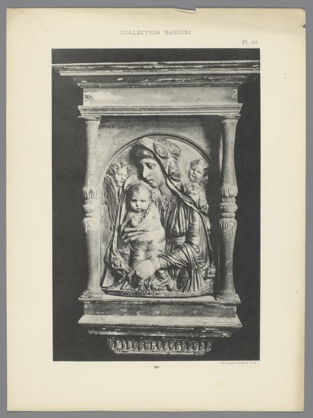 Curator: Before us, we have a photograph taken by Carl Heinrich Jacobi before 1885, capturing a relief of Mary and Christ from San Marco in Venice. My first thought? How heavy, yet how graceful! The photograph renders stone almost ethereal. Editor: Heavy is right. You can practically feel the weight of the marble—its dense grain, the labor involved in extracting, carving, and transporting it all to Venice. It’s about materiality as much as divinity, right? The stone is speaking as much as the subjects represented. Curator: Exactly! And that interplay, the material whispering beneath the spiritual narrative, is so Venetian. There’s a real earthiness there too. Look at Mary’s pose; a mother holding her child—an intimate moment caught in solid rock. Editor: Marble’s not chosen lightly. Consider how sculptors often employed slave labor or were patronized by religious institutions who demanded displays of their material wealth and political dominance through objects like this. Curator: Indeed, a photograph mutes these contexts. Though it's about capturing history, perhaps smoothing away certain harshness, that’s often what light does; it allows for a kind of forgiveness in looking. That original, haptic reality—the cool, textured stone— becomes filtered, abstracted by the lens. We’re twice removed, then. Editor: The photographic print further flattens the three-dimensional form and renders even more ambiguous. Though intended as documentation, such images also transform an artifact of class and industry into a fetishized form of mass consumption. Curator: Well, looking at this now I’m struck by the enduring dialogue between human intention and natural elements. It began in a quarry long ago, then manifested into form. A kind of artistic alchemy continues—changing, changing, changing... Editor: Ultimately, that metamorphosis is one we as art historians play a role in, shaping its meaning for today and whatever conversations come tomorrow. Thank you, Jacobi.